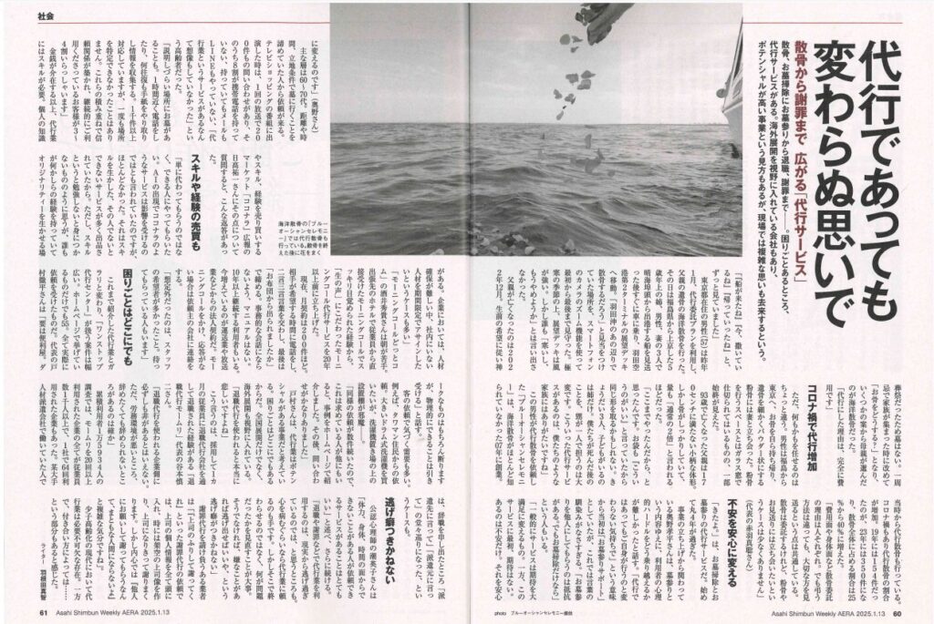 朝日新聞出版「AERA 2025年1月13日号」にて、ブルーオーシャンセレモニーの海洋散骨が取材を受けました。 ”散骨から謝罪まで 広がる「代行サービス」”という特集で代行散骨を実施したお客様のインタビューを含めて掲載されています。