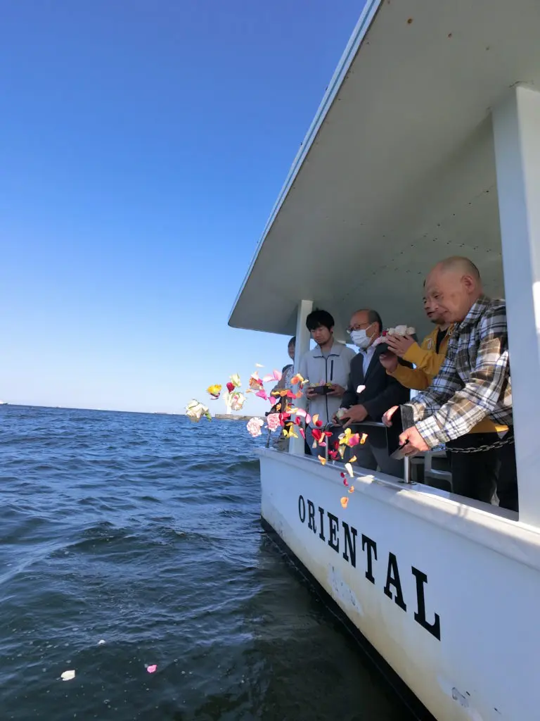 散骨は故人の生前の希望でした。献花用花びらも白のリースも海に浮かんでとてもきれいでした。