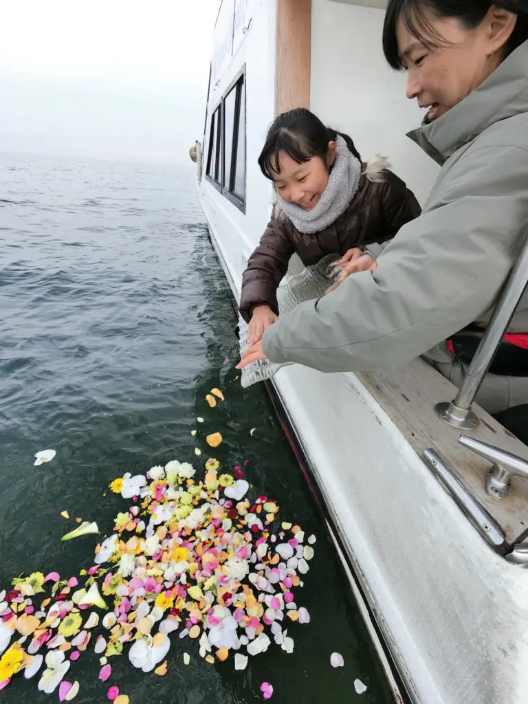 思いをこめて散骨し、海のスケールの大きさに感動し、おひさまの日ざしのあたたかさにも感激でした。
